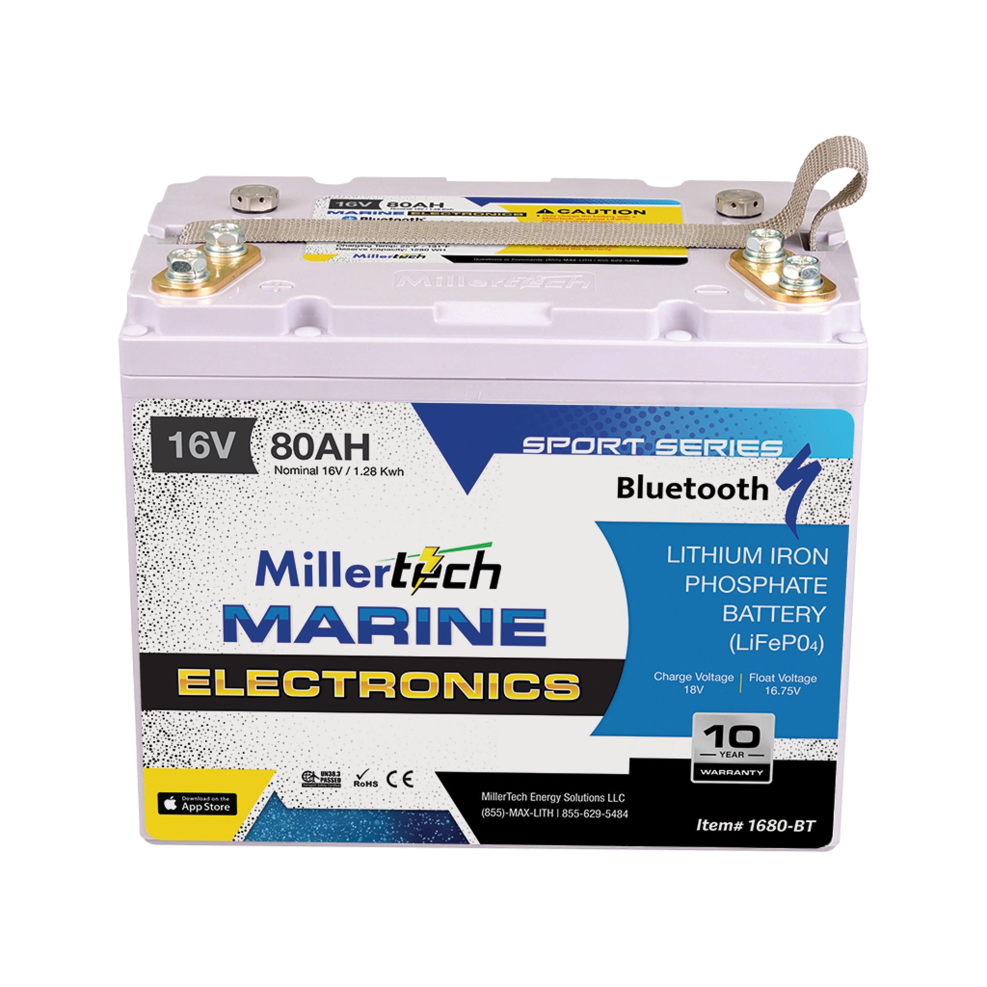 MillerTech 80Ah 16V MARINE Electronics Bluetooth Lithium Iron Phosphate (LiFePO4) Deep Cycle Battery (1680BT)